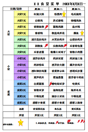 ?常見(jiàn)的營(yíng)養(yǎng):A、碳水化合物----谷類(lèi)、薯類(lèi)等 B、脂肪----烹調(diào)用油及食物本身 C、蛋白質(zhì)----肉、魚(yú)、蛋、奶、豆及谷類(lèi) D、礦物質(zhì)----紅肉類(lèi)、動(dòng)物血、肝臟、牛奶、豆制品、綠葉蔬菜等 E、維生素----動(dòng)物肝臟、魚(yú)類(lèi)、蛋類(lèi)、肉類(lèi)、谷類(lèi)及蔬菜水果 F、水----飲水和各種食物白開(kāi)水為主的飲水原則 。? 食譜的樣板: